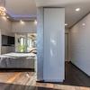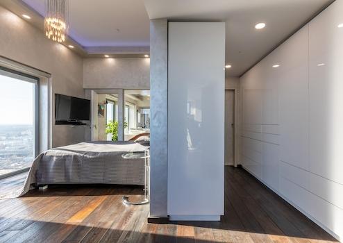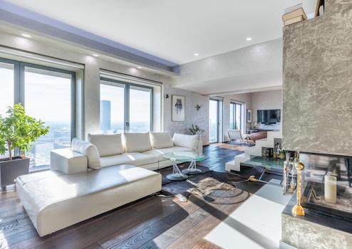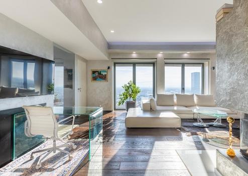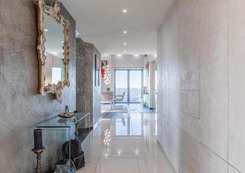 Beim Betreten der Wohnung im 22. Stock gelangt man in den zentralen Flur, welcher sowohl zwei (ev. auch drei) Schlafzimmer, Gästebad, Masterbad en Suite, Ankleideraum als auch den loftartigen luxuriösen und großzügigen Wohn- und Essbereich mit Kaminzimmer und die Küche erschließt.