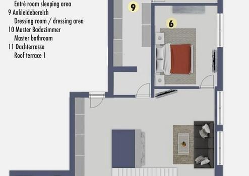 Es können ohne grossen Aufwand noch zusätzliche zwei, oder drei Wohnräume geschaffen werden als Schlafzimmer / Büro, etc., ohne den Spirit des großzügigen Loftpenthouses zu beeinflussen, oder die Lichtsituation zu verschlechtern.