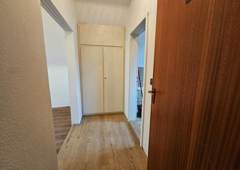 Der Flurbereich der Wohnung bietet durch den vorhandenen Einbauschrank gute Staumöglichkeiten. Von hier aus gelangen Sie in das gut geschnittene Zimmer sowie dem Wannenbad mit Fenster.