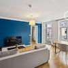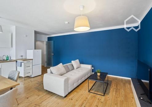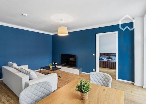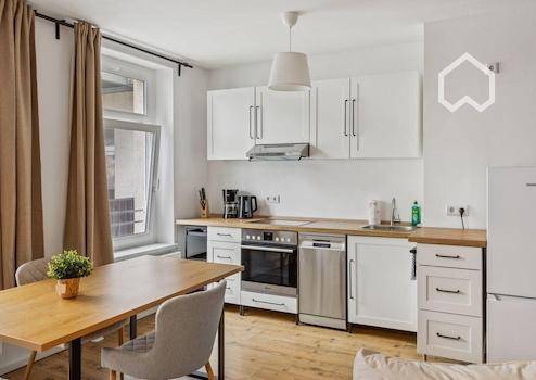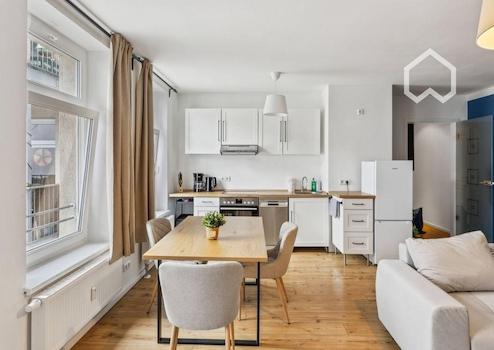Die Wohnung in der Paul-Gruner-Straße 8b in Leipzig besticht durch ihr urbanes Flair und eine stilvolle, hochwertige Ausstattung. Auf 65 Quadratmetern bietet sie ein modernes, offen gestaltetes Wohnkonzept mit liebevoll ausgewählten Möbeln. Das Wohnzimmer ist mit einem bequemen Sofa ausgestattet, das sich in ein Schlafsofa verwandeln lässt, sowie einem Flachbild-TV und einem kleinen Arbeitsbereich mit Schreibtisch. Große Fenster sorgen für viel Tageslicht und führen auf einen privaten Balkon, der mit Sitzmöglichkeiten zum Entspannen im Freien einlädt.
