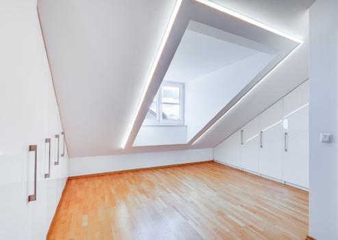 Das gesamte Dachgeschoss bildet das Masterschlafzimmer. Ein großes Fenster, eingerahmt von einem stimmungsvollen Lichtelement, durchflutet den Raum mit Tageslicht. Den Dachschrägen angepasst wurden maßgefertigte Schränke verbaut. Zusätzlich ein Schreinerbett, mit integrierter Beleuchtung und eingelassenen Steckdosen.