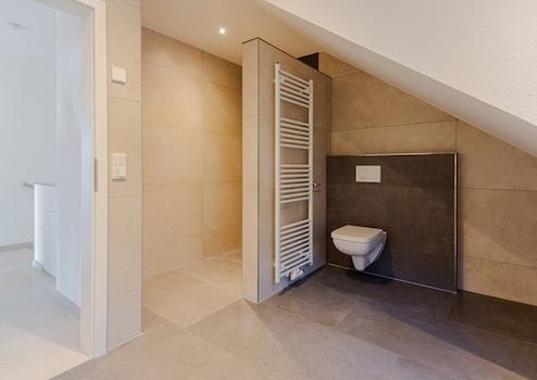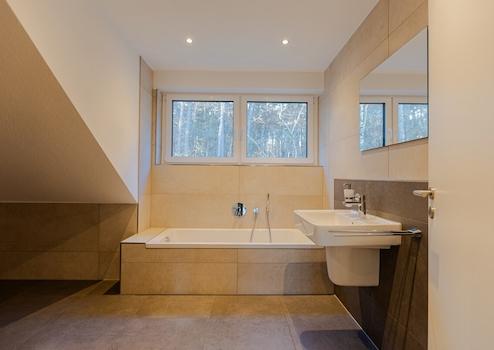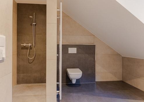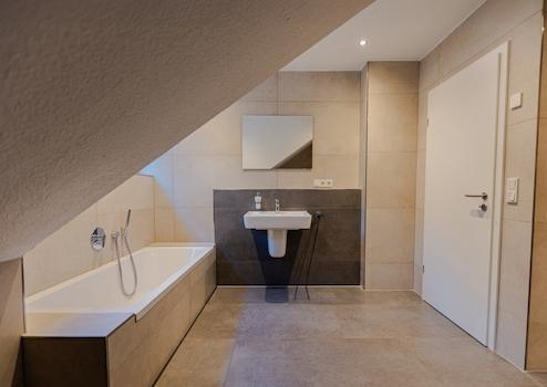 Das Badezimmer ist modern ausgestattet – mit bodengleicher Dusche, Badewanne und Waschbecken.