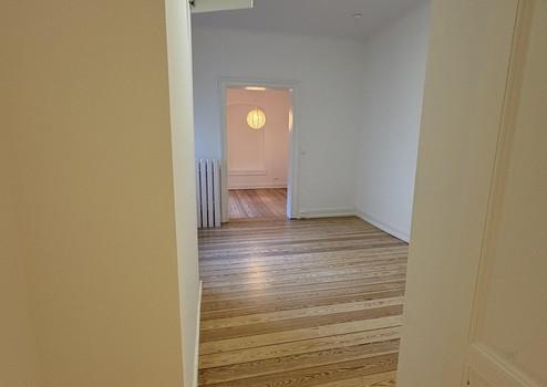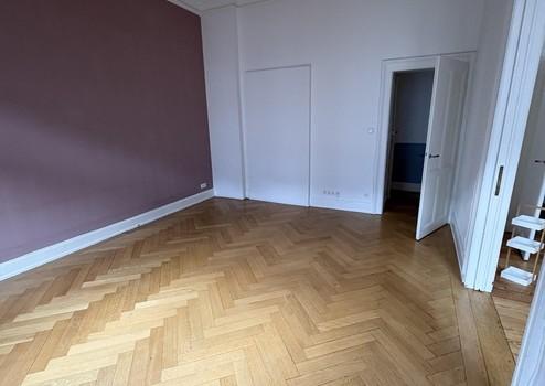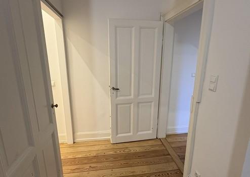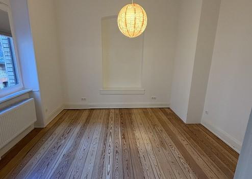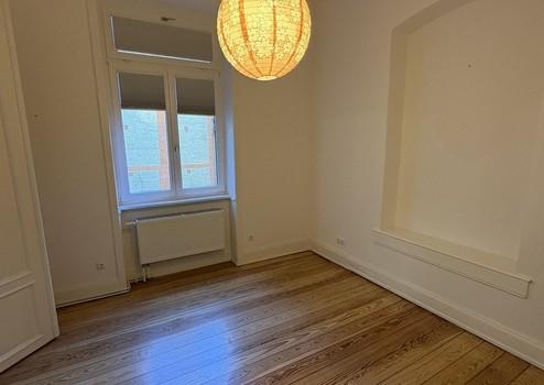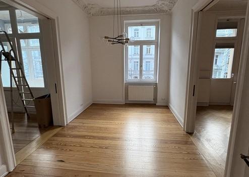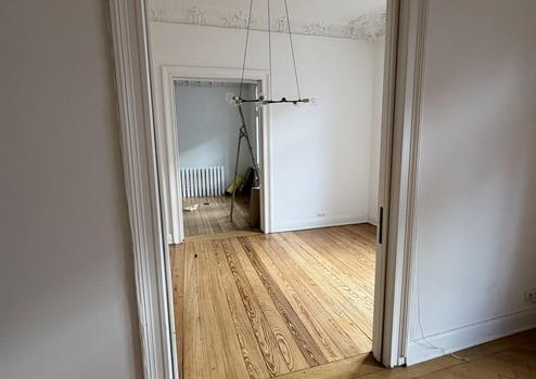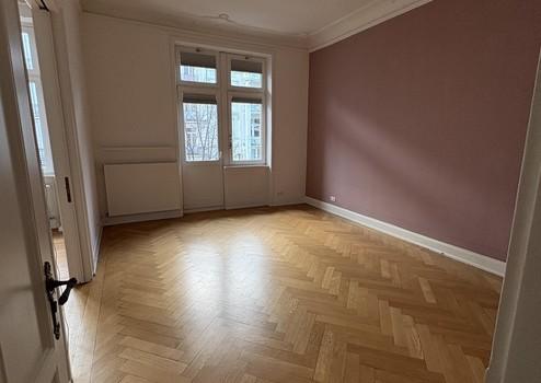 Die Wohnung liegt im 1. Obergeschoss und beeindruckt durch lichtdurchflutete Räume, hohe Decken mit Stuckverzierungen sowie charmante Zierelemente. Drei kleine Balkone bieten sowohl Morgen- als auch Abendsonne – ideal zum Entspannen im Freien. Zur Strassenseite befinden sich drei große Zimmer, die durch das Öffnen der originalen Kassettentüren ein beeindruckendes Raumgefühl erzeugen. Im größten Zimmer steht noch ein Kinderhaus, welches nach Wunsch übernommen werden kann. Auf der Seite zum Innenhof liegen die weiteren Zimmer sowie Küche und Bad. Ebenfalls bietet das in den Raum integrierte Ankleidezimmer ausreichend Platz.