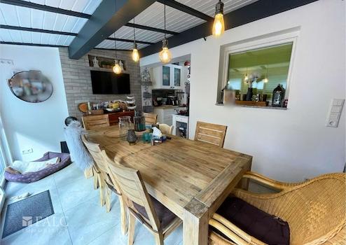 Weiter geht es in den Wintergarten, der sich ideal als Essbereich eignet und einen herrlichen Blick nach draußen bietet. Von hier aus haben Sie Zugang zur Terrasse, die zum Entspannen und Genießen der frischen Luft einlädt. Im Erdgeschoss befindet sich zudem ein praktisches, innenliegendes, Duschbadezimmer.