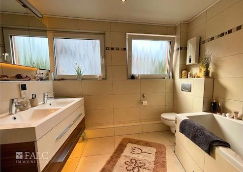 Auf der Zwischeneben zwischen Erd- und erstem Obergeschoss befindet sich das modern gestaltete Badezimmer mit Badewanne, Fenster sowie elektrischer Fußbodenheizung und sorgt für Komfort und Bequemlichkeit.