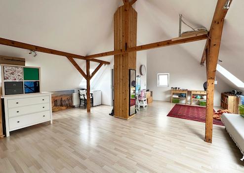 Im Erdgeschoss befindet sich eine helle 3 Zimmer-Wohnung mit Terrasse und im Obergeschoss mit gleichem Grundriss ebenfalls eine hübsche 3 Zimmer-Wohnung mit großem Balkon und dem gesamten Dachgeschoss, das aus einem hellen, großen Raum besteht.
