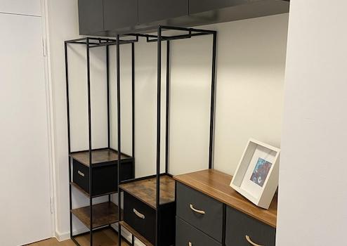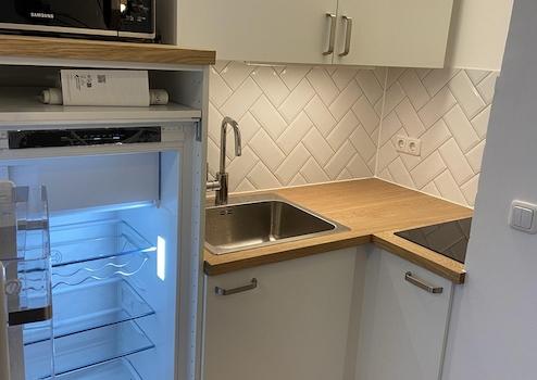 English: Newly Renovated: The apartment has been recently renovated to the highest standards, ensuring a fresh and modern living environment. It features brand new hardwood parquet flooring that adds a touch of elegance and warmth to the space. Equipped with a new fitted kitchen including a refrigerator, stove, and foldable table, it's been made functional and space-efficient. Built-in wardrobes in the hallway provide ample storage space, maintaining the apartment's sleek and tidy appearance. Included as well is a modern and well-appointed bathroom. Enjoy the outdoors from your private balcony, perfect for relaxation and taking in the neighborhood views.