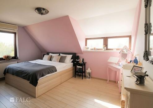 Die separat angelegte Küche liegt in kurzer Entfernung zum Essbereich, sodass gemeinsames Kochen und geselliges Beisammensein problemlos möglich sind. Über die Treppe des Eingangsbereichs erreichen Sie das Dachgeschoss: Hier befindet sich das großzügige Hauptschlafzimmer mit angeschlossenem Ankleidezimmer sowie ein weiteres Badezimmer. Ein flexibel nutzbarer Wohnraum bietet Platz für ein Arbeitszimmer oder eine gemütliche Leseecke.