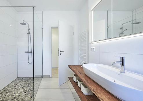 - Hochwertiges Fliesenpaket (Badezimmer, Gäste-WC, Diele, Flure, Küche) und Markensanitärobjekte.