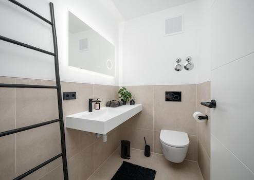 Die Sanitärräume überzeugen durch eine Kombination aus minimalistischer Formensprache, hochwertigen Oberflächen und technischer Präzision:
