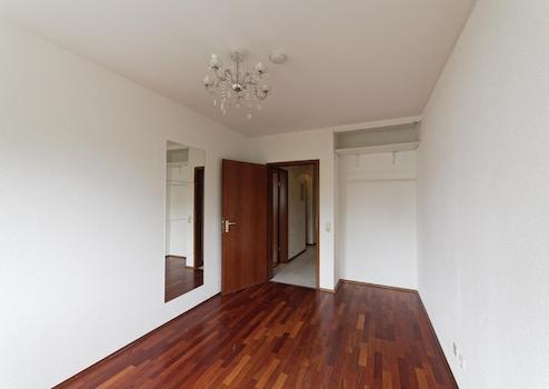 Im Schlafzimmer befindet sich großer Spiegelschrank, passend zum Parkett.