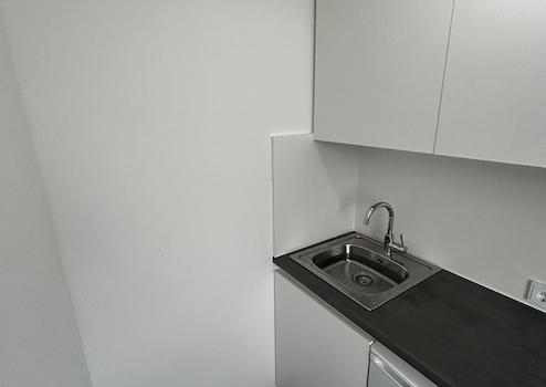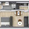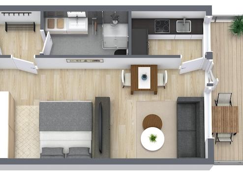 Nach dem betreten der Wohnung, im 15. Obergeschoss, befinden Sie sich im Eingangsbereich, von hieraus erreichen Sie das Badezimmer sowie den Wohn- und Schlafbereich mit angrenzender Küche und einem Balkon.