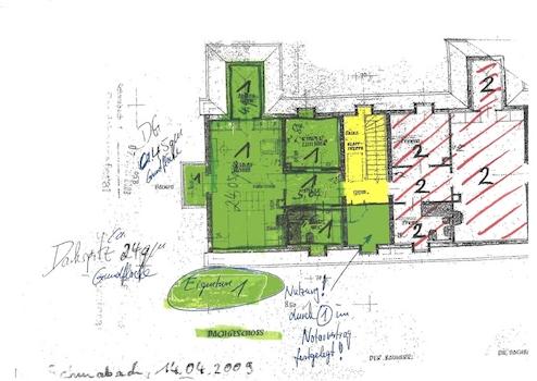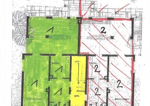 Auf den Originalplänen ist die angebotene Haushälfte in grün dargestellt.