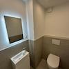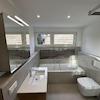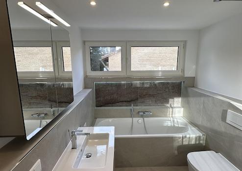 Ein großes Hauptbadezimmer mit Badewanne und bodengleicher Dusche sowie ein zusätzliches Gäste-WC, beide modern und hochwertig ausgestattet.