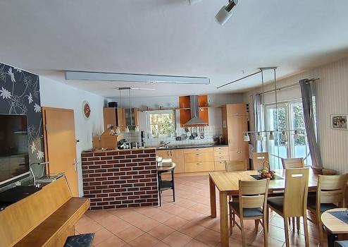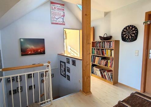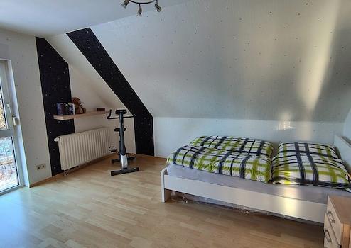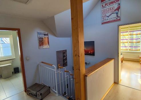 •Wohnfläche 137 m², Grundfläche 160 m² auf zwei Stockwerken zuzüglich teils wohnlich ausgebautem Dachboden mit Sonderzugang von einem der Kinderzimmer