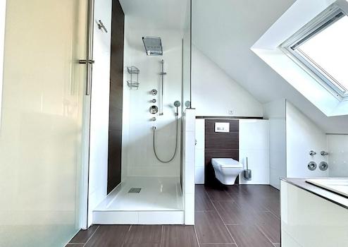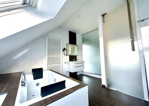 Diese Wohnung ist mehr als gewöhnlich. Sie befindet sich in einem gepflegten und überwiegend von Eigentümern bewohnten 12 Parteien Haus. Dieses ist barrierefrei gebaut und verfügt über einen Personenaufzug vom Keller bis direkt vor die Eingangstür der Wohnung. Ein offenes Wohnkonzept ausgestattet mit hochwertigen Materialen wie Granitboden, abgehängte Decken mit Einbaustrahlern (LED) und vielen Extras wie eine moderne Einbauküche mit amerikanischem Kühlschrank, Dampfbackofen, Backofen, Geschirrspüler, Induktionskochfeld und Steinarbeitsplatte . Zwei hochwertig ausgestattete Badezimmer, davon eines als Bad en Suite im oberen Stockwerk, das durch eine blickdichte maßangefertigte Glaswand abgetrennt ist, hat echten Wellness Charakter und alles was man zum abschalten braucht. Whirlpool, XXL Regendusche, Ruhe, Lichtkonzept und warme Steinzeugfliesen in Holzoptik.