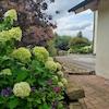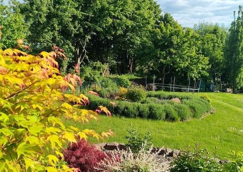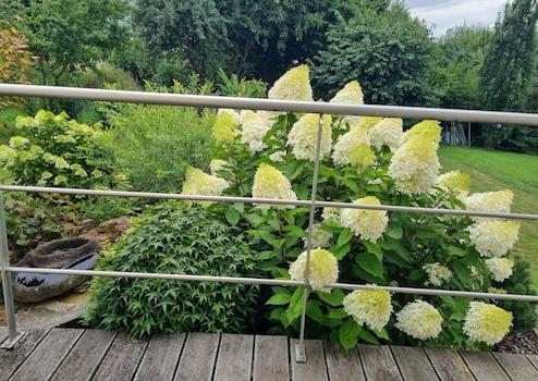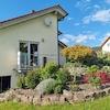 Daneben gibt es einen weiteren PKW-Stellplatz. Einfahrt, Stellplätze und Schuppen sind gepflastert. im südlichen Bereich des Gartens mit leichter Hanglage wurde 2020 ein Freisitz angelegt. Hier kann man die Abendsonne genißen. An der westlichen Gebäudeseite erreicht man über den Garten einen ca. 20 m² großen Geräteschuppen, der 2024 gebaut wurde. Hier ist reichlich Platz für Gartengeräte. im Schuppen befindet sich außerdem ein Hauswasserwerk. Eine Wasserleitung ist bis zur Terrasse der Südseite verlegt. Der Regenrückhaltebehälter wurde beim Bau größer als gefordert gewählt und gewährt so mehr als 1.500 Liter Regenwasser zur Gartenbewässerung. Alle Dachrinnen sind aus Kupfer. Das Grundstück schließt lediglich im Westen an ein Nachbargrundstück an. Östlich und südlich befinden sich keine unmittelbaren Nachbargrundstücke. Da sich an der Nordseite der Grundstücksgrenze die öffentliche Straße befindet, besteht im Winter keine Räumpflicht von Gehwegen. Der Garten ist sehr liebevoll, jedoch möglichst pflegeleicht angelegt. Die bepflanzten Beete sind zum Teil mit Rindenmulch, zum anderen Teil mit wasserdurchlässigen Lavasteinen gegen übermäßigen Unkrautwuchs gesichert. Beim größten Teil der Bepflanzung wurde großen Wert auf Bienen- und Insektenfreundlichkeit gelegt. Direkt an der Natursteintreppe von der Terrasse in den Garten befindet sich ein kleiner Teich mit Wasserfall.