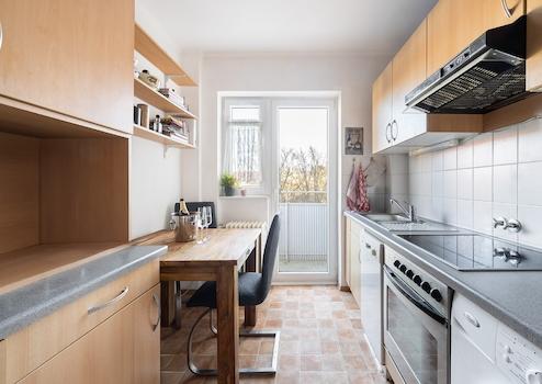 Die Küche ist mit einer Einbauküche ausgestattet,