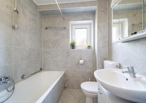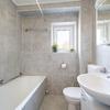 Badezimmer ist zeitlos gefliest und verfügt -- wie