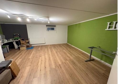 Ausgebauter Hobbykeller ca. 35 qm. Fußboden im Hobbyraum ist ein Laminat auf Korkbasis.