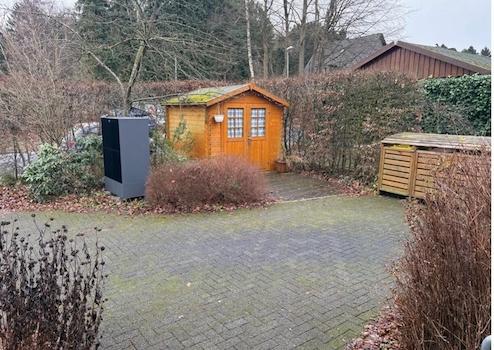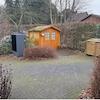 Gartenhaus hinten im Garten und Fahrradschuppen vorne zur Straße gelegen.