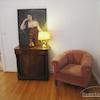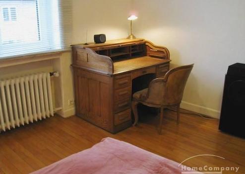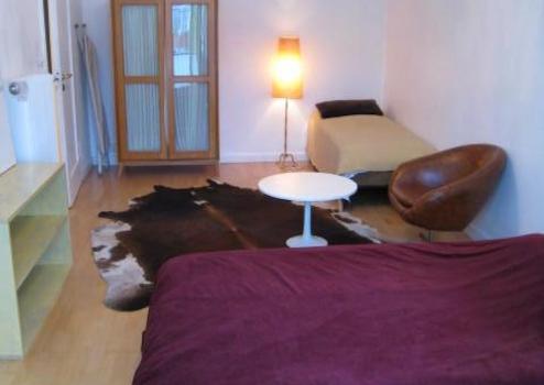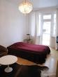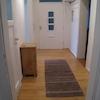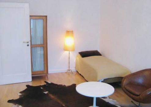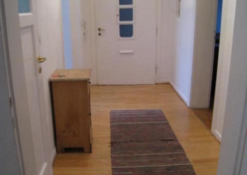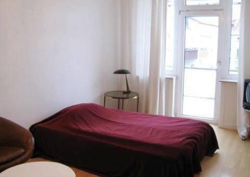 Mehrfamilienhaus in ruhiger Straße. Modern möblierte Wohnung, Kiefernholzmöbel. Wohnzimmer mit Couch, Tisch, Kommode, Vitrinenschrank, Korbstuhl, Schreibtisch mit Stuhl, DVBT-TV. Schlafzimmer mit Doppelbett, Kommode, ...