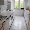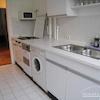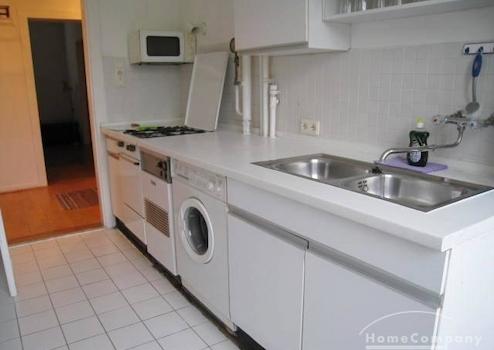 Küche komplett eingerichtet, Ausziehtisch, Waschmaschine, Fliesen.