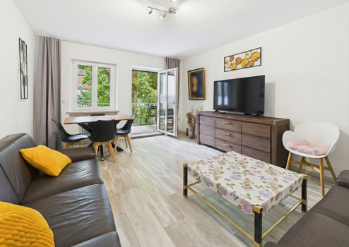 The spacious living and dining area forms the heart of the apartment and provides direct access to the large balcony. The balcony faces the inner courtyard and offers a pleasant view of the Hanreibach stream, creating a distinctive living atmosphere with water views.