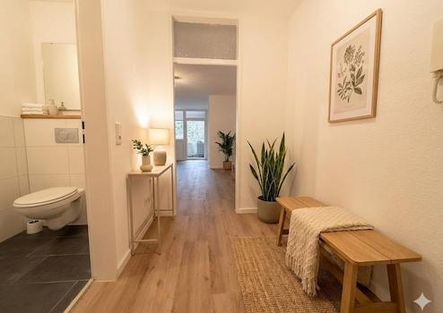Diese frisch renovierte Wohnung im zweiten Obergeschoss überzeugt durch ihren hellen, modernen Grundriss und einen außergewöhnlich angenehmen Wohnfluss. Bereits die Diele empfängt Sie mit einer offenen, einladenden Atmosphäre und bietet als besonderes Highlight ein eigenes Gäste-Duschbad. Damit lässt sich der Gäste- und Familienbereich ideal voneinander trennen – ein Komfort, der in dieser Wohnungsgröße selten zu finden ist. Von der Diele aus öffnet sich der großzügige Wohn- und Essbereich, der durch seine Helligkeit, seinen klaren Schnitt und den direkten Blick auf die Loggia begeistert. Hier entsteht sofort ein Gefühl von Weite, Ruhe und Wohnqualität, das den Alltag spürbar aufwertet. Die Loggia erweitert den Wohnraum nach draußen und eignet sich perfekt für gemütliche Abende, entspannte Kaffeepausen oder gesellige Sommertage.