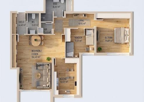 Die Wohnung ist digital möbliert und wird unmöbliert übergeben. Die gezeigten Bilder dienen ausschließlich der Inspiration zur möglichen Einrichtung; leichte Abweichungen zur tatsächlichen Wohnung sind möglich.