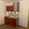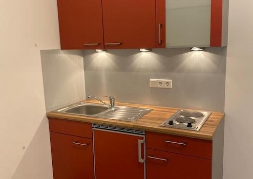 - Teeküche mit Einbauspüle, Unterbaukühlschrank, 2 Kochfeldern