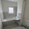 - hell gefliestes Badezimmer mit Badewanne und Fenster
