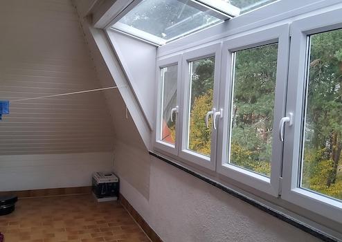 Tageslichtbad (inkl. Waschmaschinenanschluss), einem Wintergarten, einem Pkw-Stellplatz, Kellerraum und zusätzlich einem großräumigen Spitzboden (begehbar über eine herausklappbare Leitertreppe).
