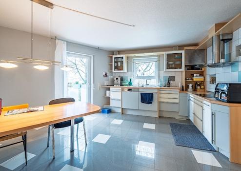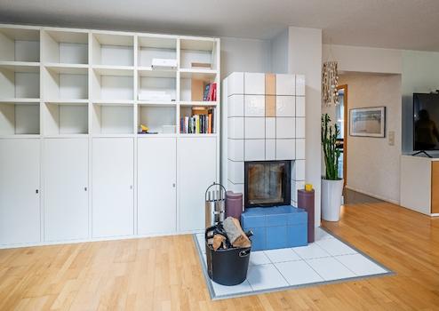 Herzstück des Hauses ist das weitläufige Wohn- und Esszimmer - ein lichtdurchfluteter Raum mit großen Fensterflächen und einem harmonischen Blick in den umlaufenden, gepflegten Garten. Ein behaglicher Kamin schafft dabei ein besonders gemütliches Ambiente und lädt zum Verweilen ein. Vom Wohnzimmer aus gelangen Sie direkt auf die Terrasse und in den Garten. Auch von der angrenzenden, großzügig gestalteten Küche besteht ein direkter Zugang auf eine zweite Terrasse, die sich ideal für entspannte Stunden im Freien anbietet. Der im Wohn- und Essbereich verlegte hochwertige Parkettboden sorgt für eine warme und einladende Wohnatmosphäre.