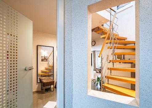 Der im Obergeschoss verlegte edle Korkboden verleiht den Räumen eine zeitlose Eleganz, während die in allen gefliesten Bereichen integrierte Fußbodenheizung für behaglichen Wohnkomfort sorgt.