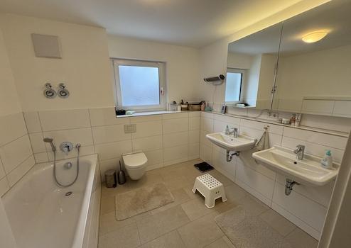 - Tageslichtbad mit heller Wandverfliesung und Bodenfliesen in moderner Steinoptik; zwei einzelne Waschtische, große Badewanne (180x80cm) und Hänge-WC