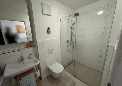 - Duschbad mit bodengleicher Dusche, Waschtisch und Hänge-WC