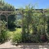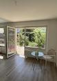 Vom Wohnzimmer aus geht der Blick auf die sonnige Terasse. Hier sitzt man abseits jeglicher Strassen geschützt durch Markise und bewachsene Pergola und kann den naturnahen Garten genießen.