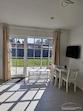 Wohnraum mit Bett, Tisch, Schrank, offener Küche. Helles Duschbad.