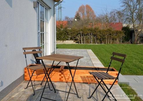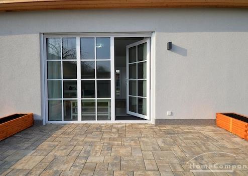 Terrasse, Außen-Jalousien, Fußbodenheizung.