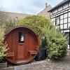 Ruhiger, gepflegter Hof mit überdachter Terrasse und Fasssauna für 4 Personen. Carport (1999), aktuell genutzt als Abstellfläche.