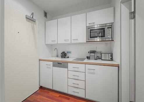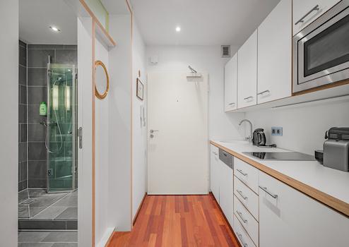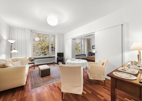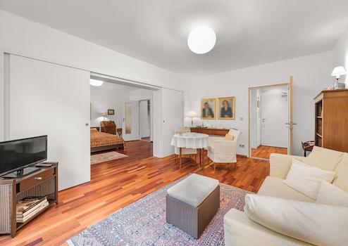 Die Wohnung entstand durch die Zusammenlegung von zwei Apartments und bietet nun großzügige zwei Zimmer. Der Eingangsbereich ist praktisch gestaltet und beherbergt eine platzsparende Küchenzeile. Das Wohnzimmer und das Schlafzimmer überzeugen durch große Fensterflächen, die viel Licht in die Räume lassen.