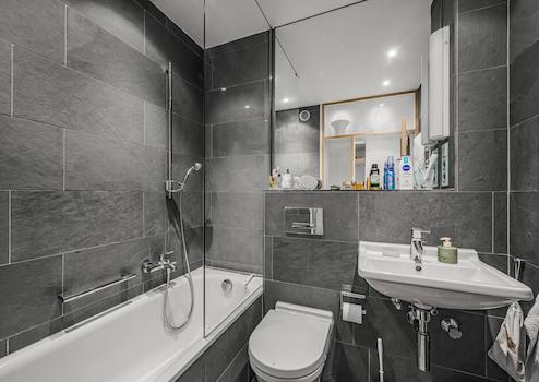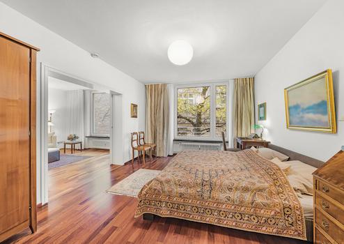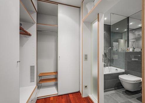 Beide Zimmer verfügen über ein eigenes Badezimmer: das eine mit einer Badewanne, das andere mit einer modernen Dusche. Im Schlafzimmer befindet sich zudem eine praktische Ankleide mit Einbauten, die zusätzlichen Stauraum bietet. Stilvoller Parkettboden aus dem Holz der Jatoba-Palme unterstreicht das angenehme Wohnambiente, und ein Wasch- und Trockenraum in der Anlage steht den Bewohnern ebenfalls zur Verfügung.