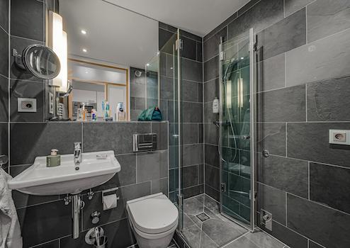 - Natursteinfliesen (Schieferfliesen) in den Bädern