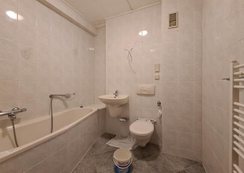 - gefliestes Wannenbad mit Deckenspots, praktischen Handtuchheizkörper und Waschmaschinenanschluss