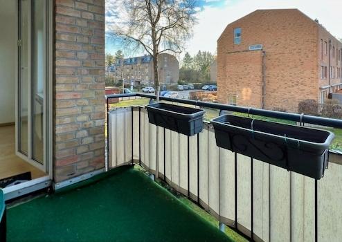 Diese Wohnung befindet sich in einer verkehrsberuhigten Zone, umgeben von großen Grünflächen und altem Baumbestand.