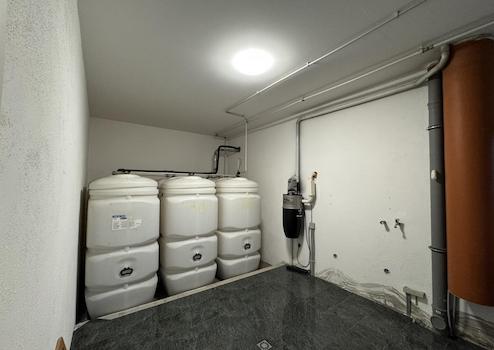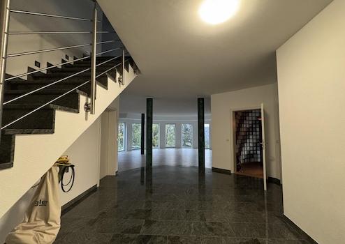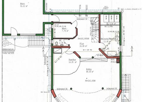 Im Untergeschoss befindet sich ein großer Hobbyraum mit fast 70qm. Hier befindet sich auch die Sauna. Des Weiteren gibt es den Heiz- / Waschraum, ein WC, einen weiteren Kellerraum und ein Büro. Der Garten ist hier vom Büro und Hobbyraum direkt begehbar.