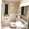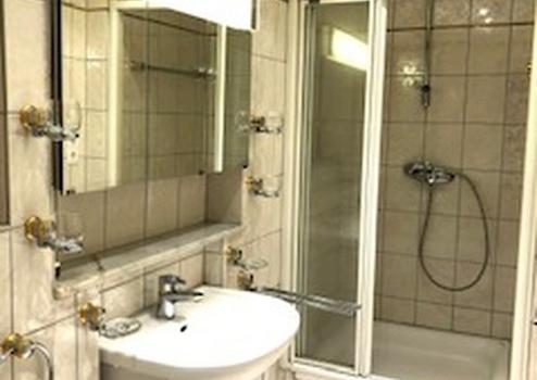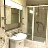Das Bad verfügt über eine Duscholux Duschwanne mit Sicherheitsglas, Keramag Keramik und Waschtischschrank und Hansgrohe Armaturen und Dusche (chrom/gold).