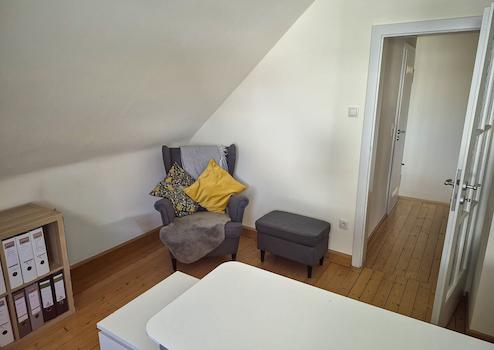 Im Obergeschoss befinden sich drei weitere Zimmer, die individuell als Schlafzimmer, Kinderzimmer oder Büro genutzt werden können. Jedes Zimmer ist gut geschnitten und bietet ausreichend Platz für die persönliche Entfaltung. Das Badezimmer auf dieser Etage ist mit einer Dusche ausgestattet und bietet einen direkten Zugang zum Balkon..