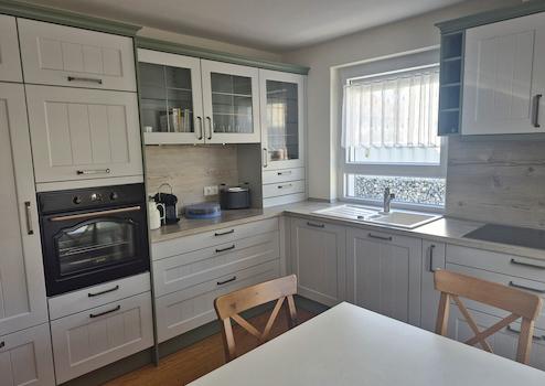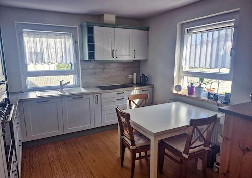Vom Wohnzimmer aus gelangen Sie in die angrenzende Küche, die funktional und modern ausgestattet ist. Hier finden Sie genügend Raum für einen Esstisch, an dem die Familie gemeinsam die Mahlzeiten genießen kann. Die Küche ist der ideale Ort, um kulinarische Köstlichkeiten zuzubereiten und bietet einen schönen Ausblick in den Garten.